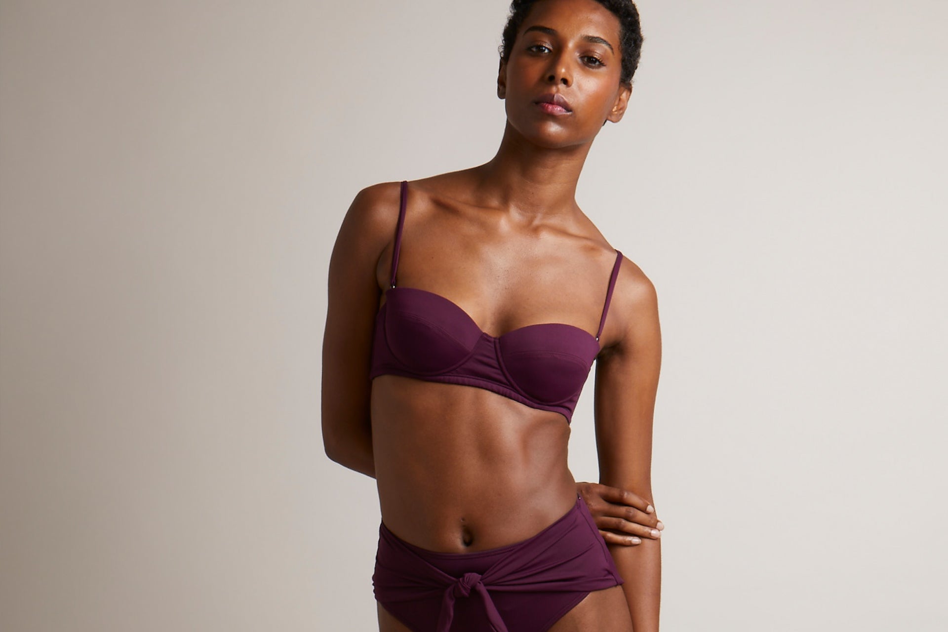 The Buzios bikini top is a 70s sporty shape finished with a twist-knot front and a low back, this shape works well for all cup sizes. With a soft triangle style cup, the top offers good support with a medium amount of coverage. The straps and waistband are adjustable and fixed at the back with a gunmetal hook and fabric fastening at the centre back.
